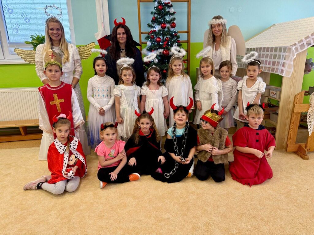 6. prosince jsme se převlékli do čertích a andělských převleků. Ve třídě nás čekalo zábavné vození na obláčku a v čertím kotlíku. U stolečku jsme plnili jeden těžký čertí úkol, který jsme všichni skvěle zvládli. Po tanečkách jsme zaslechli čerta u nás za dveřmi, když jsme ale otevřeli dveře, žádný čert tam nebyl. Našli jsme tam balíčky a dopis od Mikuláše, čerta a anděla. Protože nám dopis a nadílka udělaly velkou radost, rozhodli jsme se jim na jejich dopis odpovědět. Dnes byla i velká sněhová nadílka, proto jsme se moc těšili, až si zařádíme v čerstvě napadeném sněhu a postavíme prvního sněhuláka. Fotogalerie
