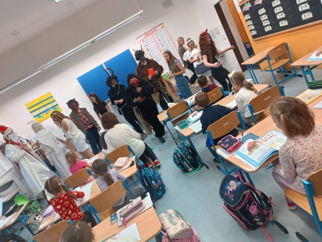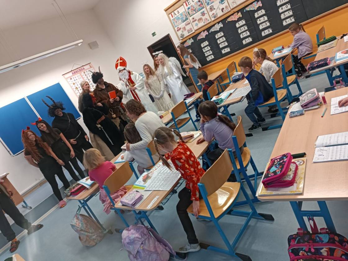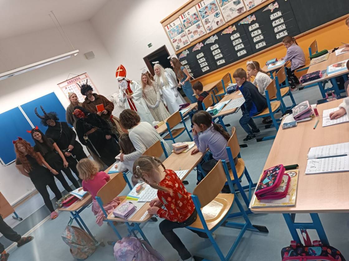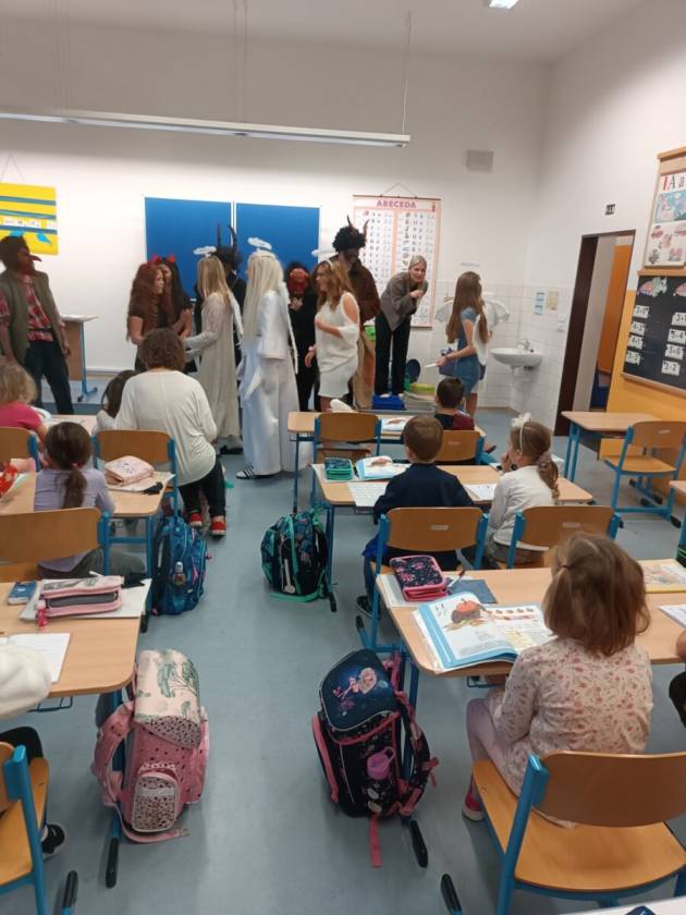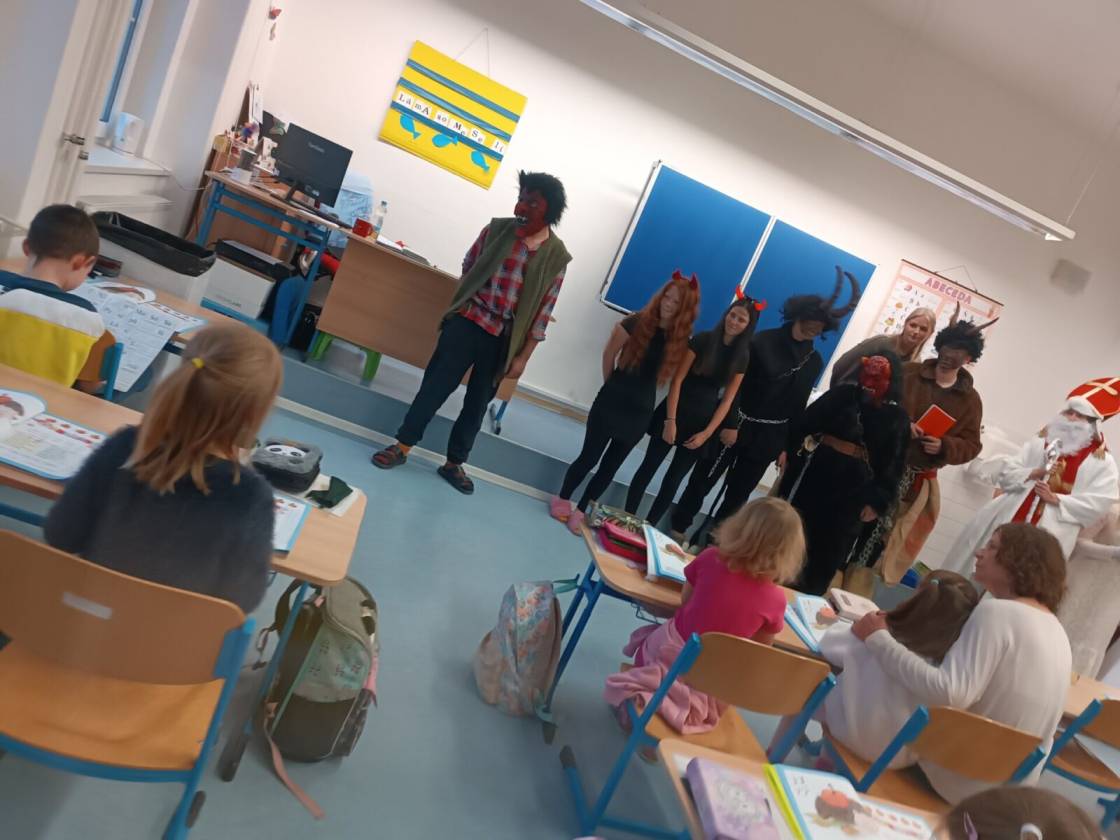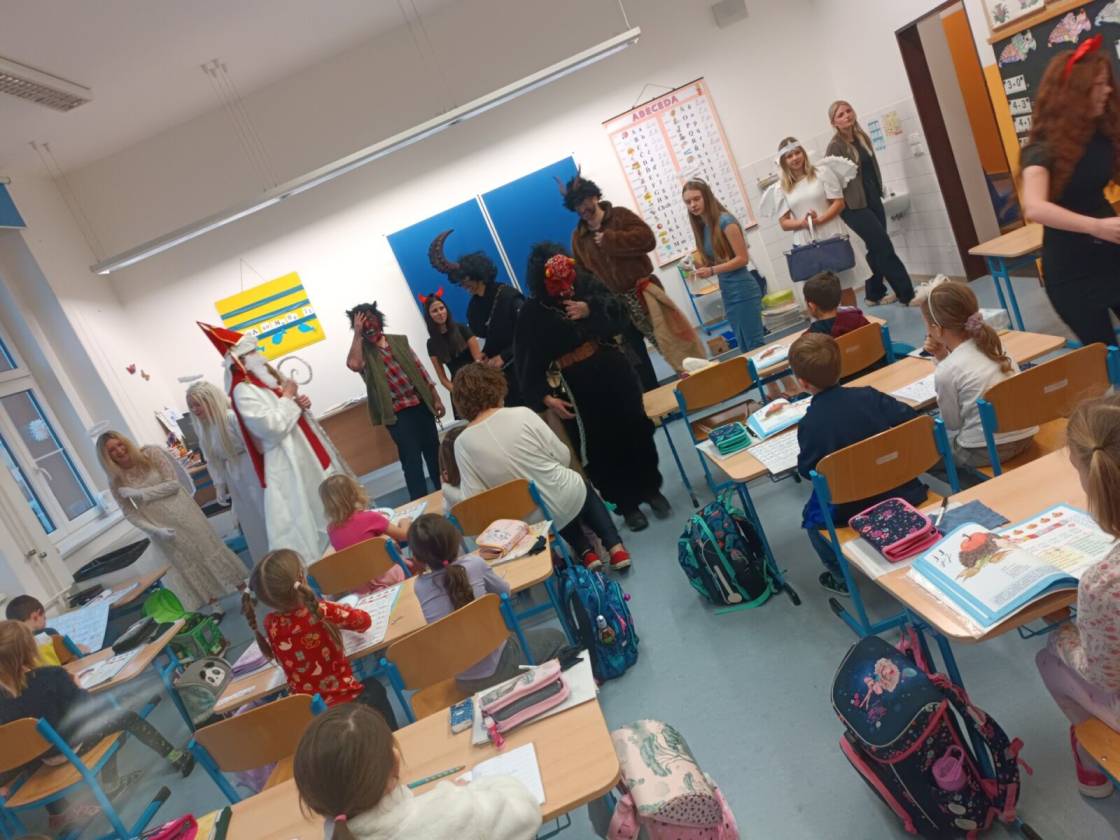 V pátek 5. 12. 2025 chodil ve škole Mikuláš s čerty a anděly, za které se převlékli žáci z 9. tříd. Navštívili mimo jiné i 1.A. Děti se nejprve trochu lekly, ale nakonec zazpívaly krásnou písničku a Mikuláš jim rozdal malé dárečky a pochválil je. Čerti odešli s nepořízenou.