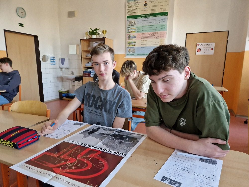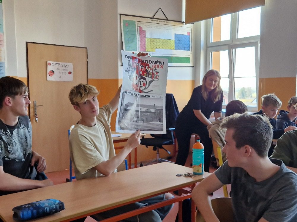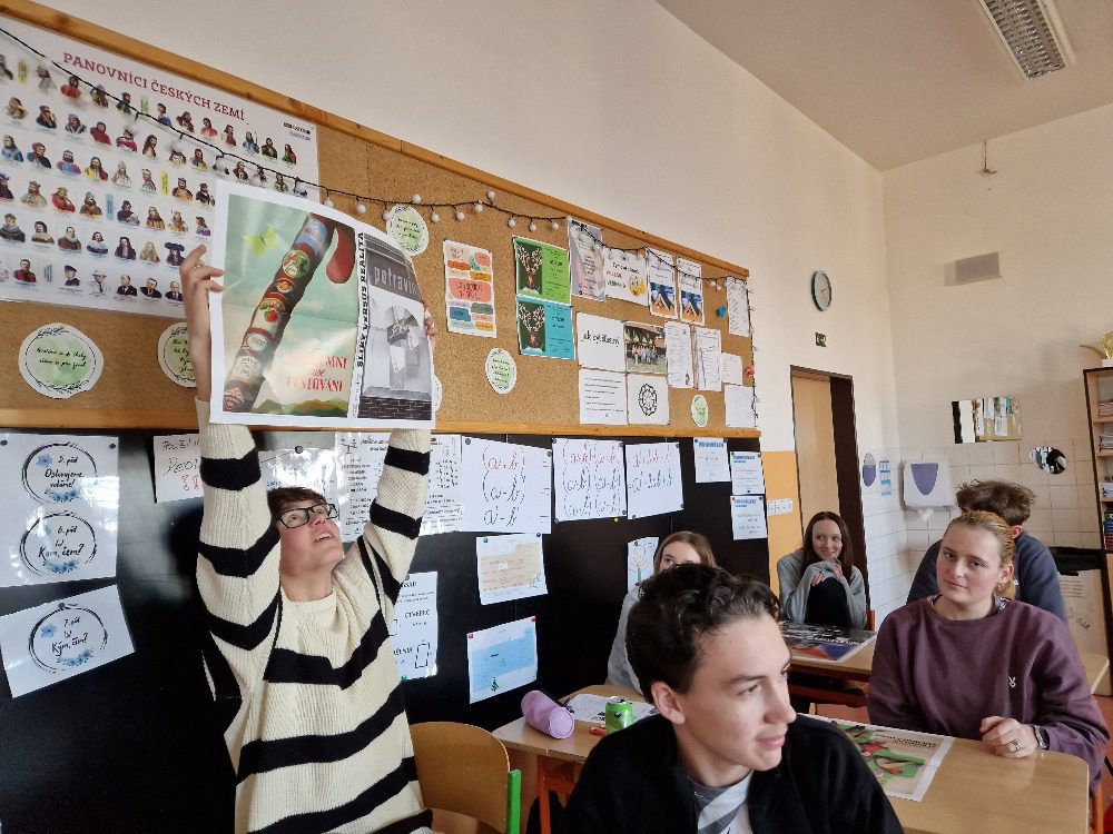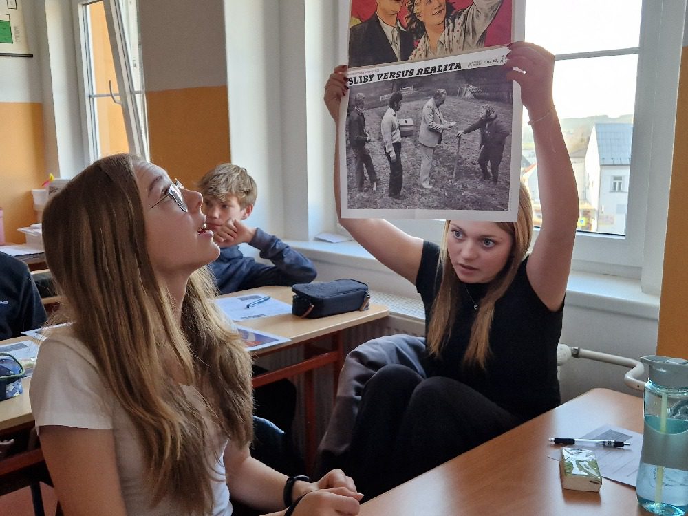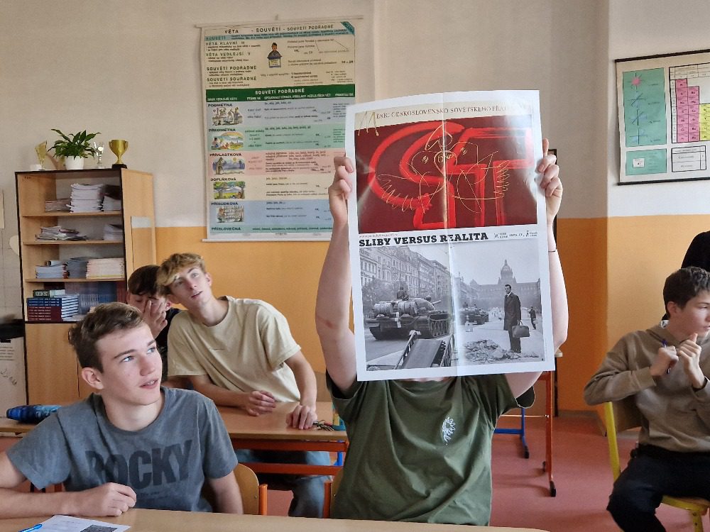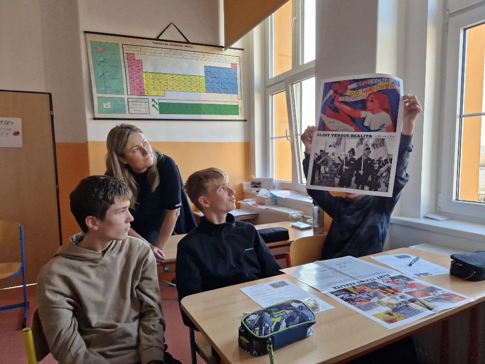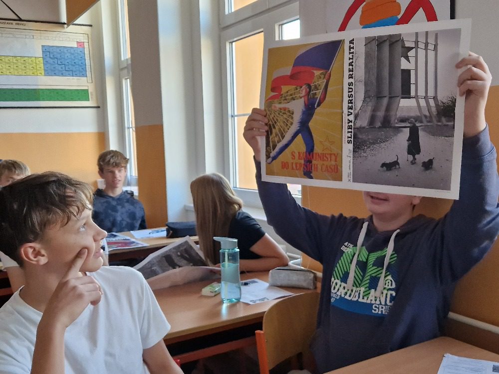 Během výuky jsme využili několika metod kritického myšlení, které přispívají k samostatnému myšlení žáků, ke snaze umět porovnávat, vyvozovat a dávat věci do souvislostí a snaží se žáky přimět k vyjádření svých bezprostředních pocitů. V 9.B jsme také stihli zamyslet se nad významem plakátů, které vznikly právě pro účely využití během těchto projektů. Výstavka nazvaná Sliby versus totalita zachycuje nástroje komunistické propagandy a jako protiklad předkládá fotografie zachycující skutečnost pravdivě. Závěrečnou aktivitou byla práce s fotokomiksem. Žáci dostali předtištěný příběh a jejich úkolem bylo doplnit komentář. Ne všem se úplně dařilo, mnohým se nechtělo přemýšlet, mnozí nesledovali film tak bedlivě, aby pak na základě jeho zhlédnutí byli schopní s těmito materiály pracovat.