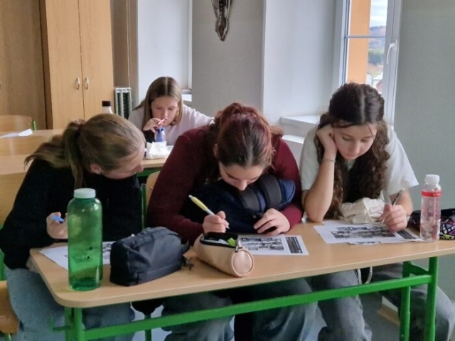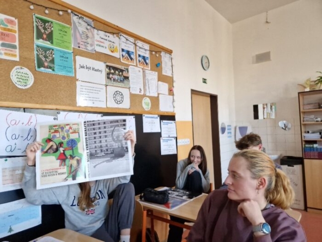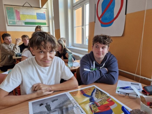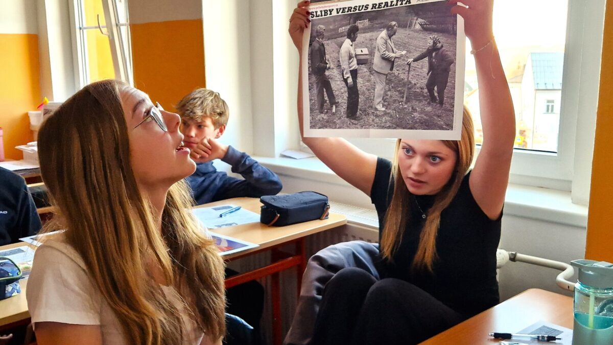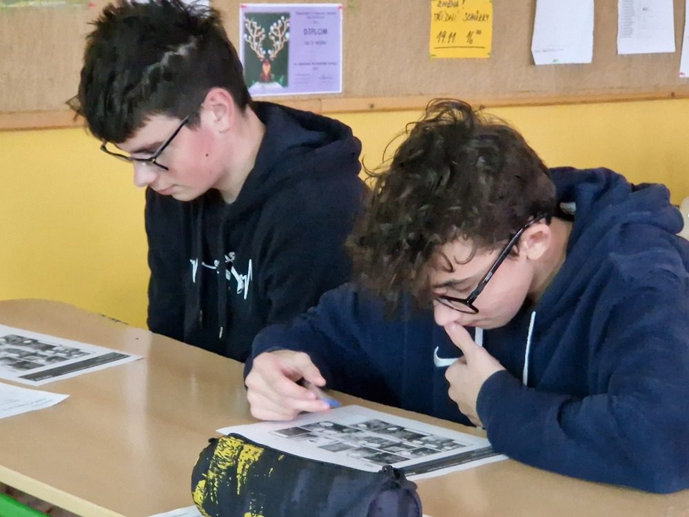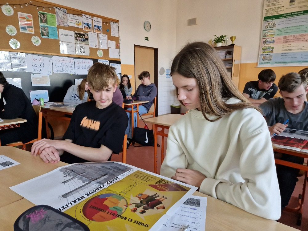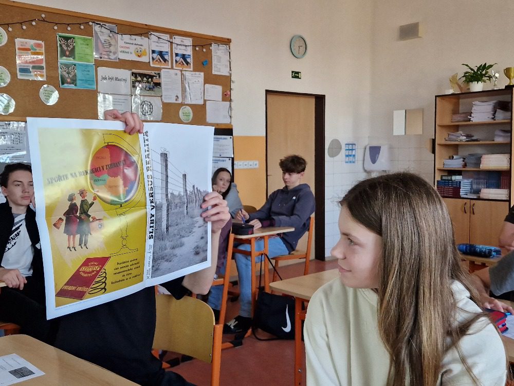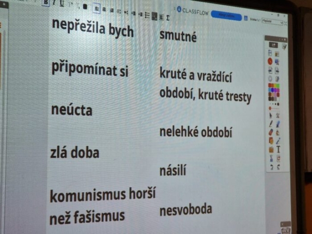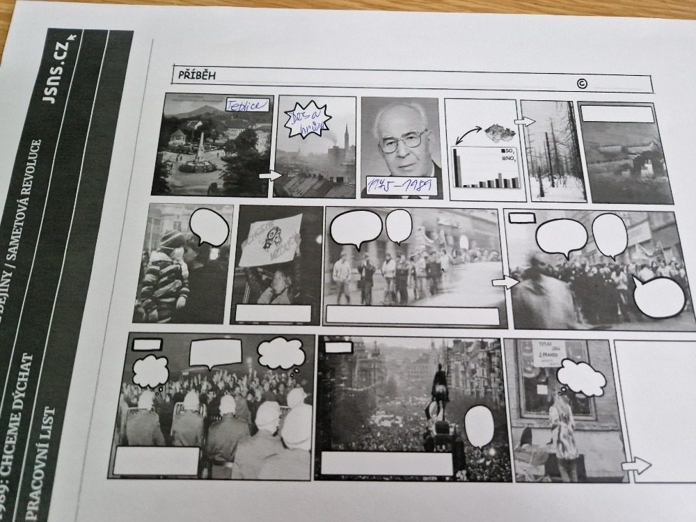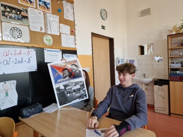 Během výuky jsme využili několika metod kritického myšlení, které přispívají k samostatnému myšlení žáků, ke snaze umět porovnávat, vyvozovat a dávat věci do souvislostí a snaží se žáky přimět k vyjádření svých bezprostředních pocitů. V 9.B jsme také stihli zamyslet se nad významem plakátů, které vznikly právě pro účely využití během těchto projektů. Výstavka nazvaná Sliby versus totalita zachycuje nástroje komunistické propagandy a jako protiklad předkládá fotografie zachycující skutečnost pravdivě. Závěrečnou aktivitou byla práce s fotokomiksem. Žáci dostali předtištěný příběh a jejich úkolem bylo doplnit komentář. Ne všem se úplně dařilo, mnohým se nechtělo přemýšlet, mnozí nesledovali film tak bedlivě, aby pak na základě jeho zhlédnutí byli schopní s těmito materiály pracovat.