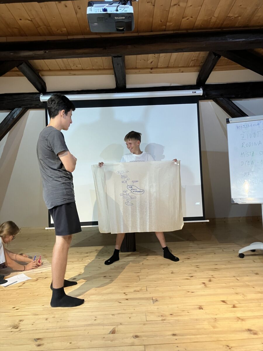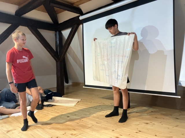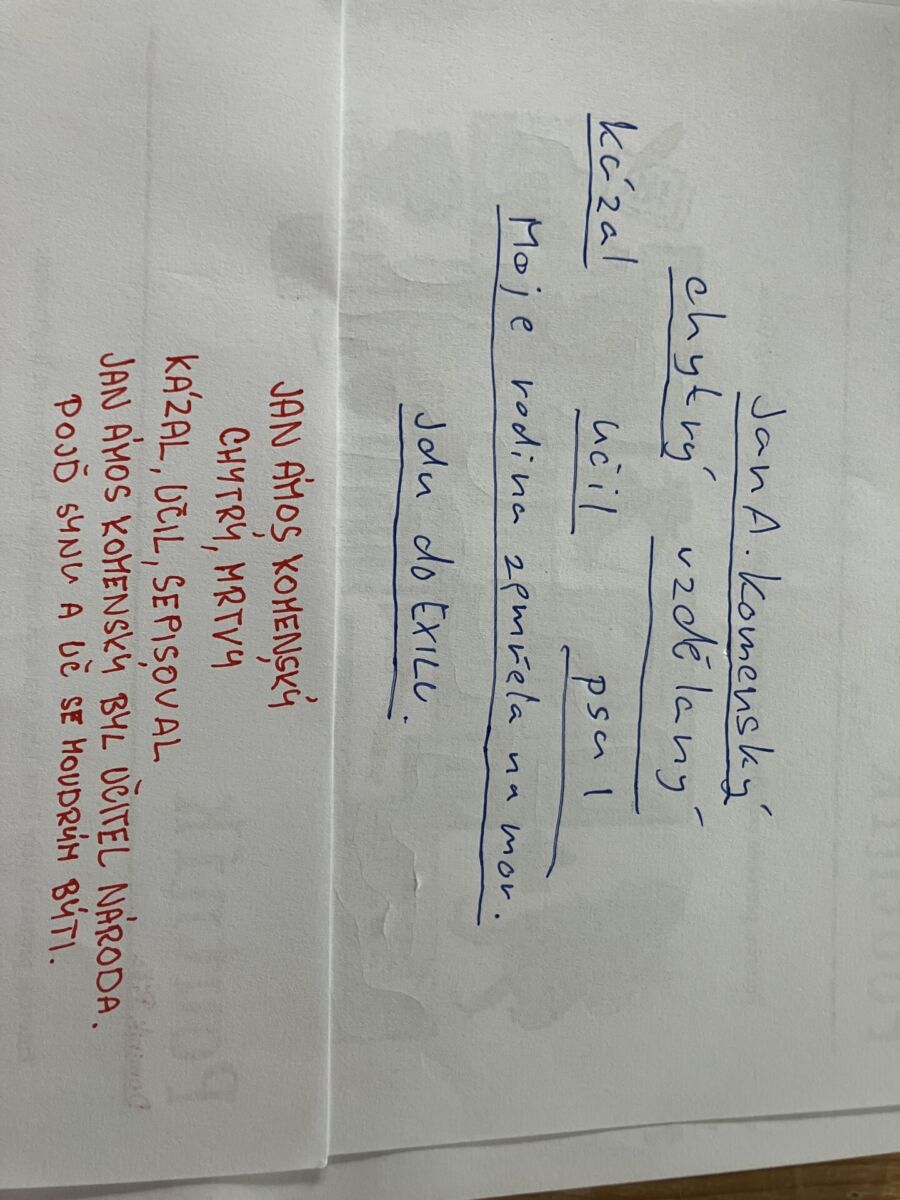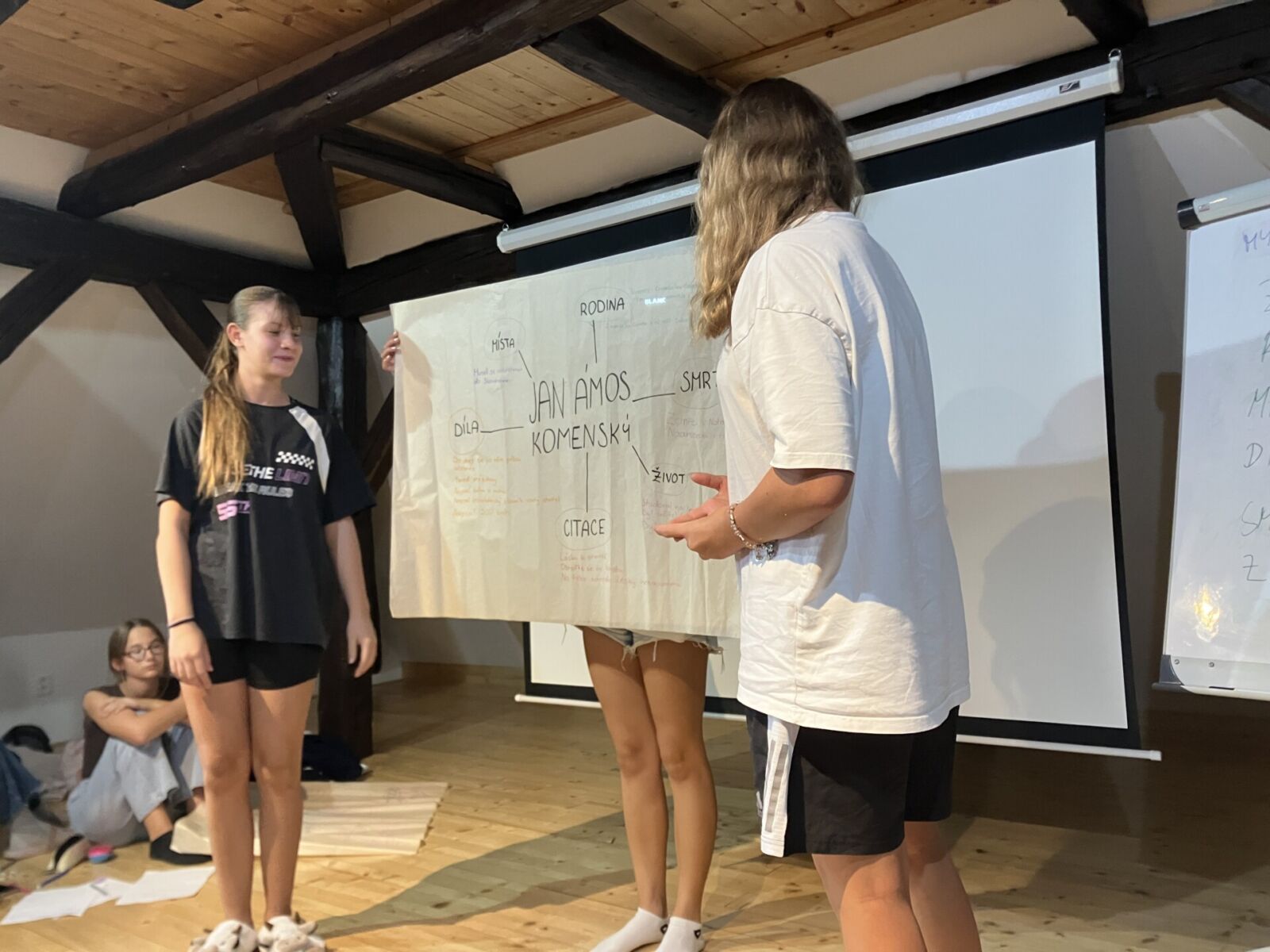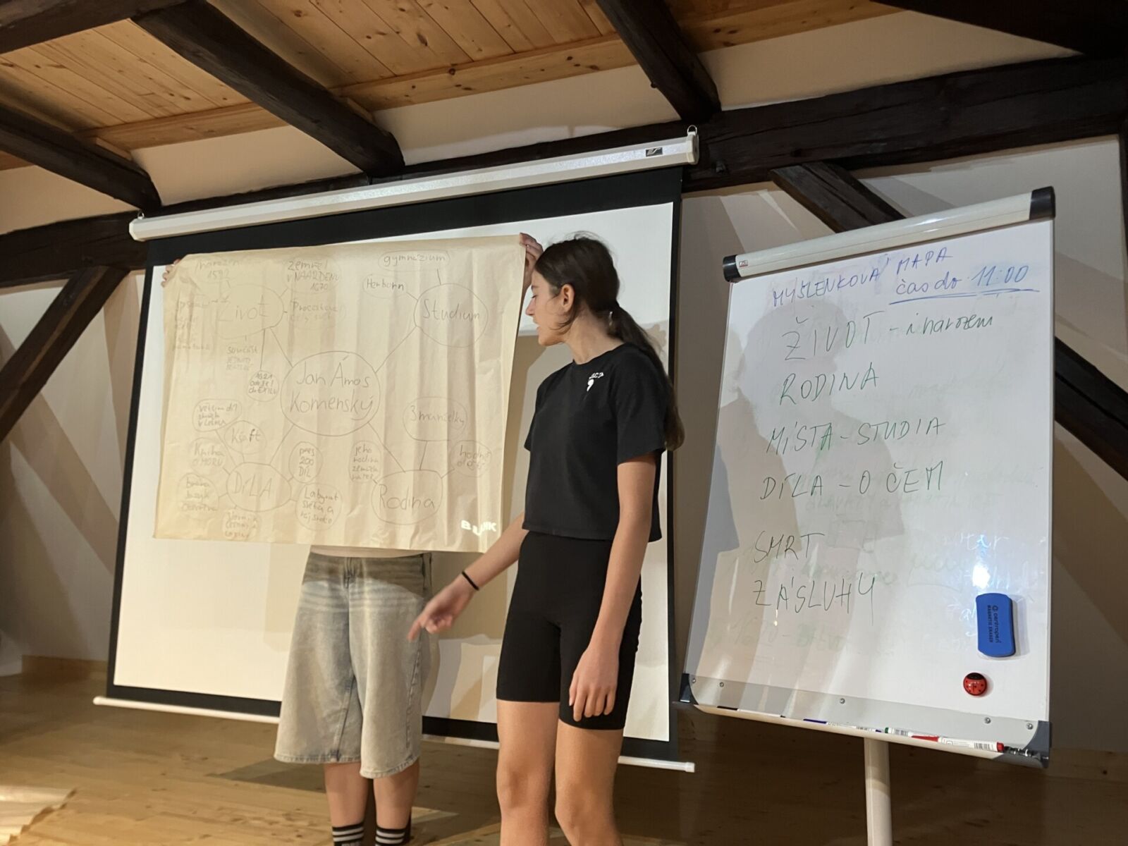 9 září, 2025Na čtvrteční nocování v knihovně navázali žáci 8.B projektovým dnem, jehož téma bylo zpočátku zahaleno tajemstvím. Pomohly ho odhalit indicie, které nashromáždili žáci ve středu v Mladé Boleslavi cestou z hradu na nádraží. Postupným dešifrováním se dostali k postavě Jana Amose Komenského. Aby pochopili dobu, ve které žil, zdramatizovali události stavovského povstání vedoucí k bitvě na Bílé hoře. Nakonec došlo i na samotnou bitvu a poražení zakusili pocity frustrace, které bezpochyby zažívali i čeští stavové. Po osvěžení pohybem jsme se přesunuli zpět do knihovny a po zhlédnutí krátkých videí sestavili žáci ve skupinkách myšlenkové mapy. Po vyřešení labyrintu (..světa a ráj srdce) jsme shrnuli všechny nově nabyté vědomosti a vydali jsme se domů dohnat spánkový deficit.