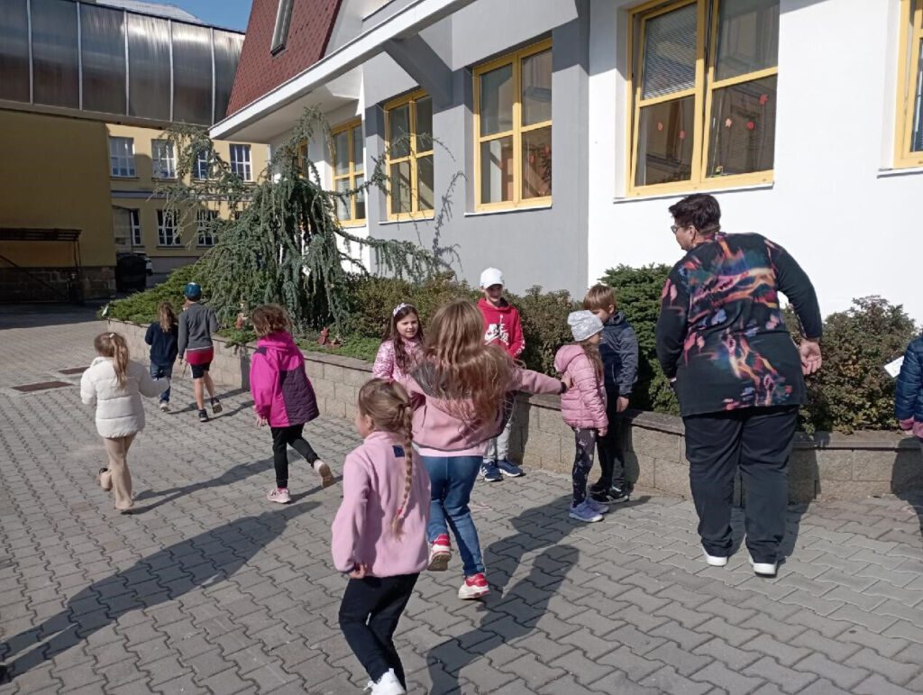 Děti se měly pohybovat po vyznačených šipkách a plnit úkoly, které byly rozmístěné po celé školní zahradě a školním dvoře. Celkem splnily 45 úkolů.