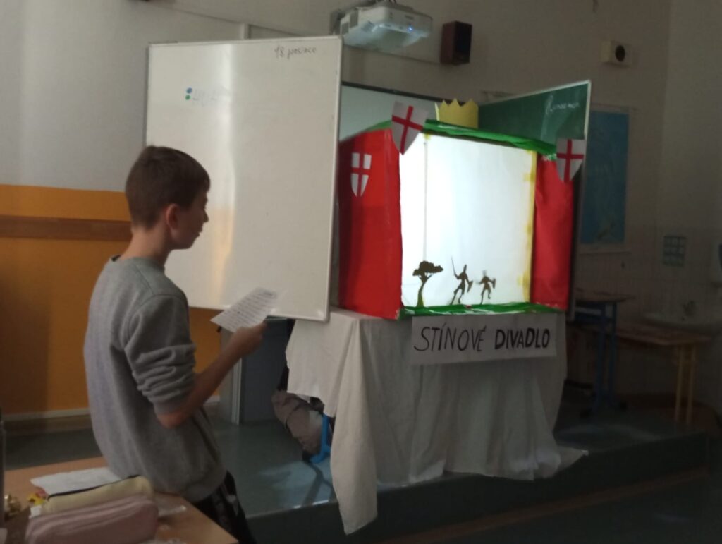 26 února, 2025Příběh o králi Artušovi ze staré Anglie ztvárnili žáci 7.B netradičním způsobem – sehráli stínové divadlo. Samotné prezentaci předcházela časově náročná týmová spolupráce – příprava scénáře, výběr loutek, sestavení scény, technické řešení osvětlení, doprovodné ozvučení příběhu. Příprava postaviček probíhala v hodinách informatiky ve speciálním programu a vyžadovala od žáků preciznost a trpělivost. O samotné zhotovení se postaral nový stroj Thundercut laser 40W, který dokáže vyříznout jakýkoli požadovaný tvar. Samotné provedení příběhu vyžadovalo spolupráci všech účastníků projektu. Poučný příběh zhlédly děti obou stupňů naší školy.