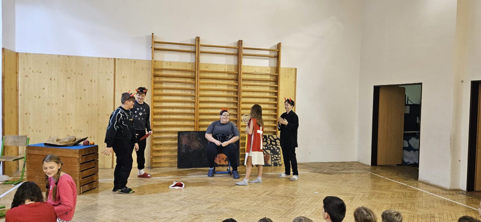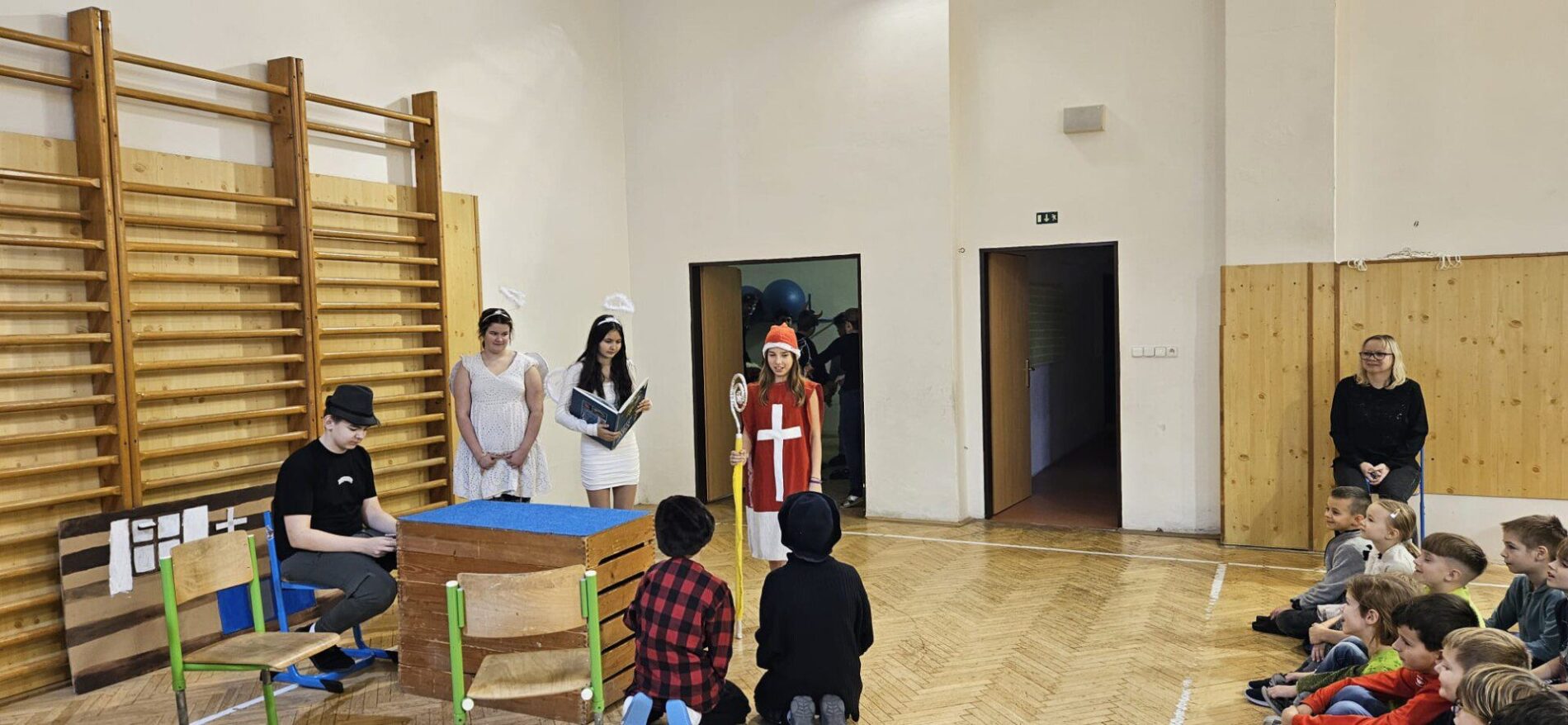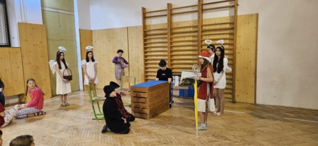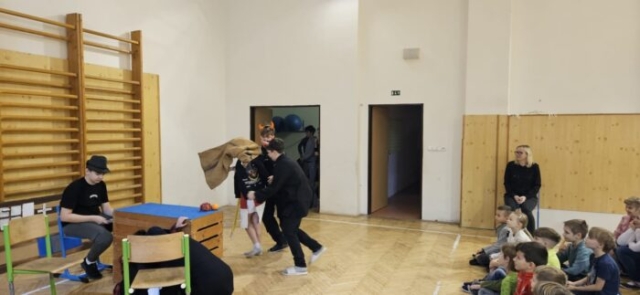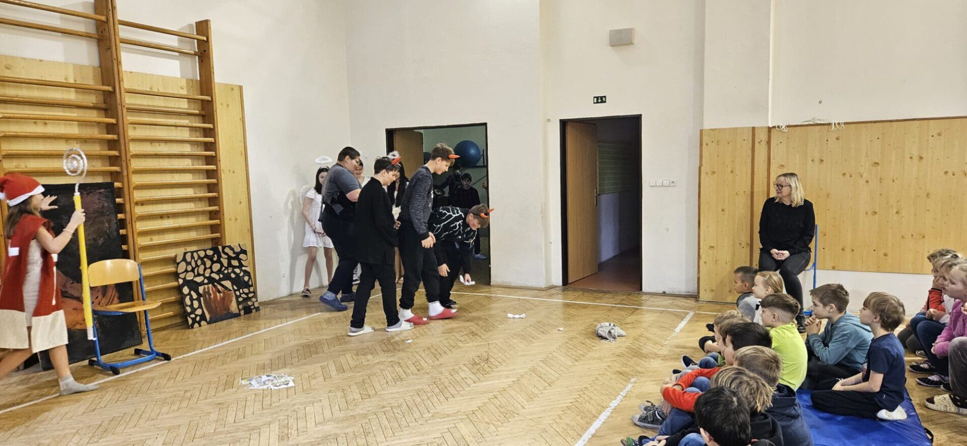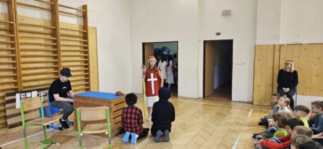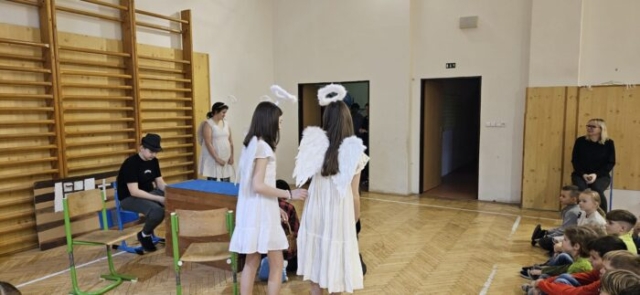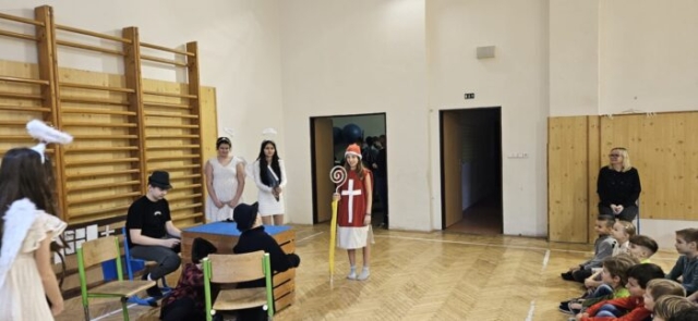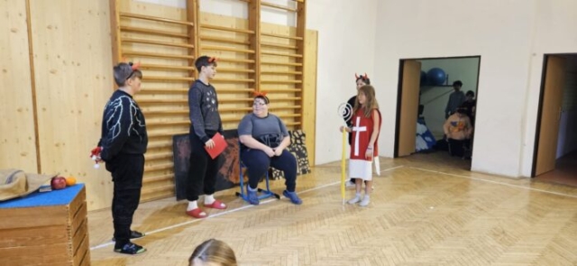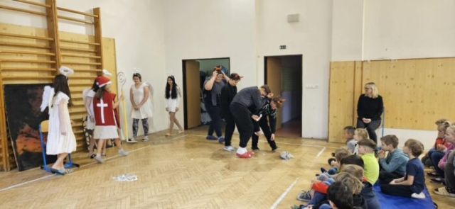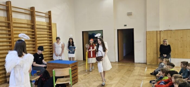 Mikuláška, andělé a čerti – jak se dala tahle skupinka dohromady? S novým pojetím příběhu o trojici, která navštěvuje v předvečer 6. prosince děti, zlobivé trestá a hodné obdarovává, přišli žáci 7.A. Vánoční příběh o popletených čertech a hodných andělech zahráli dětem 2. a 3. tříd.
