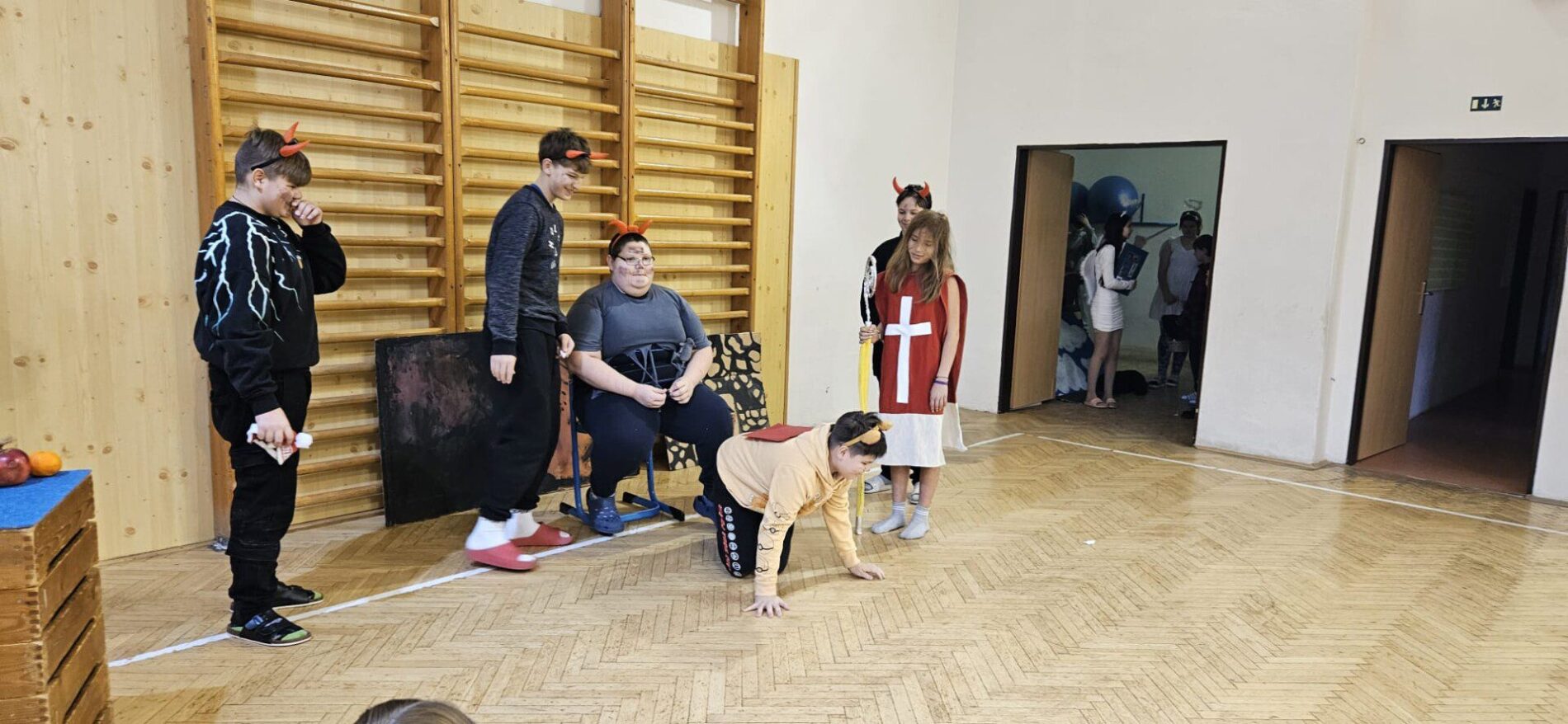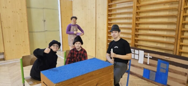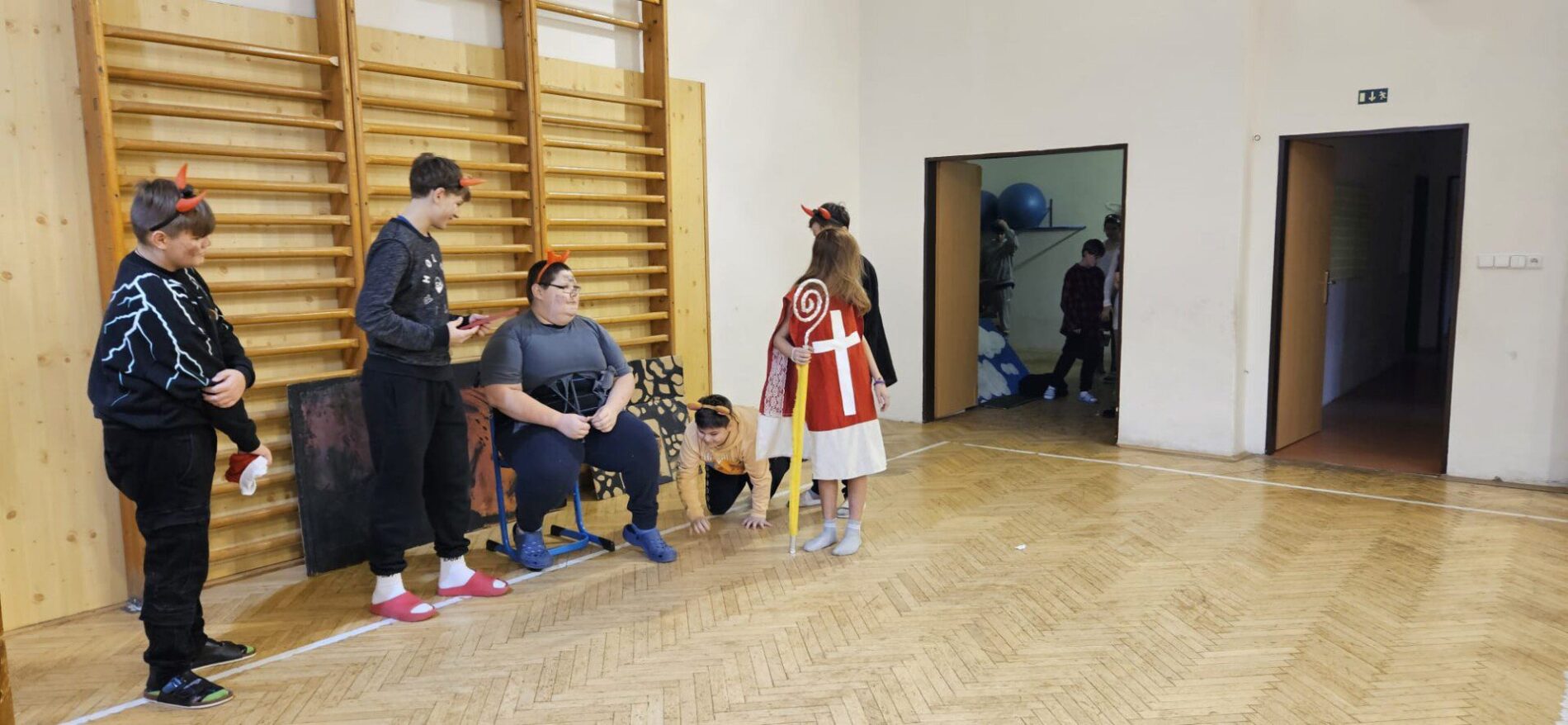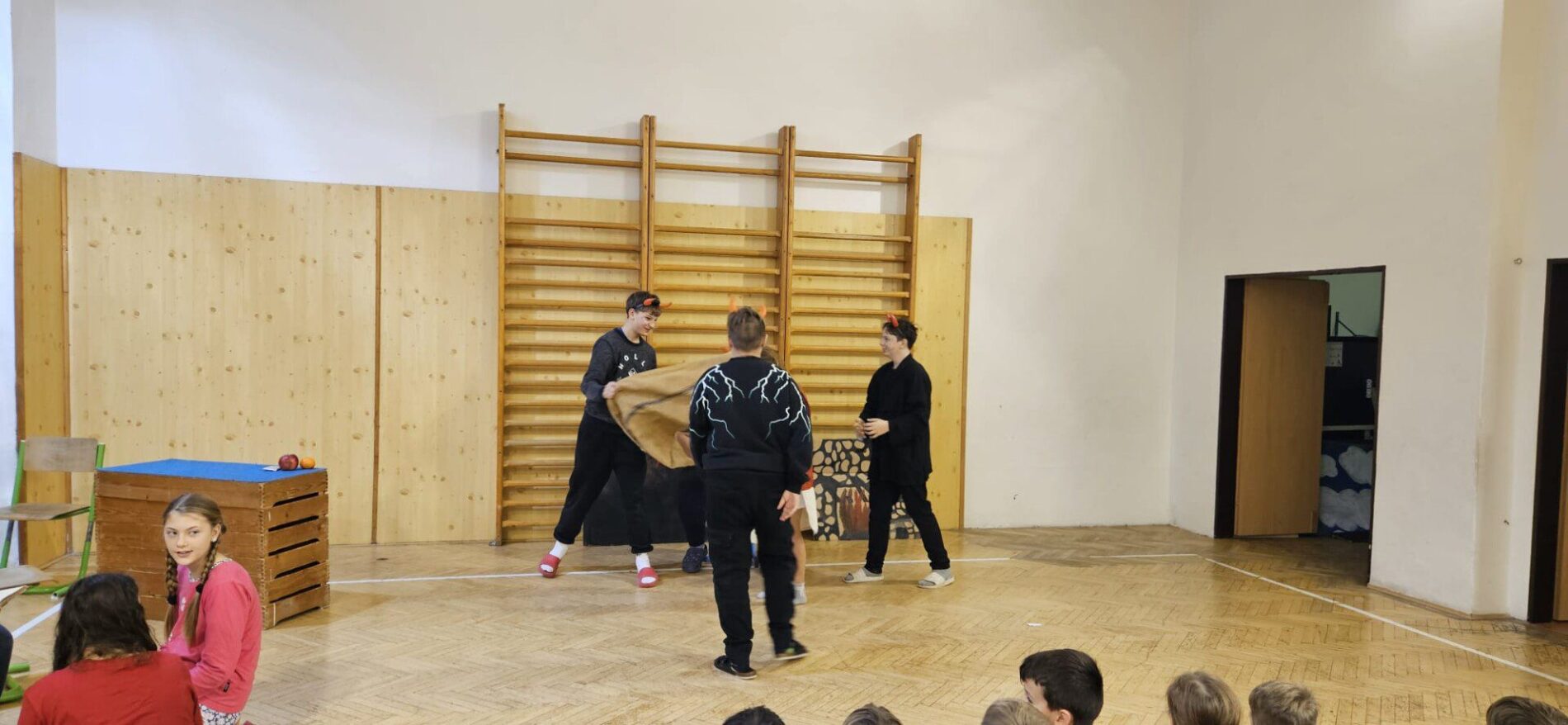 Mikuláška, andělé a čerti – jak se dala tahle skupinka dohromady? S novým pojetím příběhu o trojici, která navštěvuje v předvečer 6. prosince děti, zlobivé trestá a hodné obdarovává, přišli žáci 7.A. Vánoční příběh o popletených čertech a hodných andělech zahráli dětem 2. a 3. tříd.